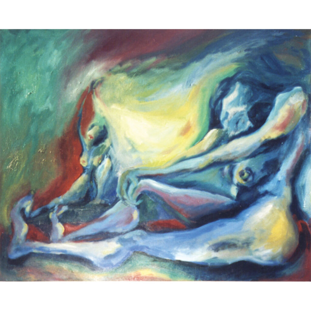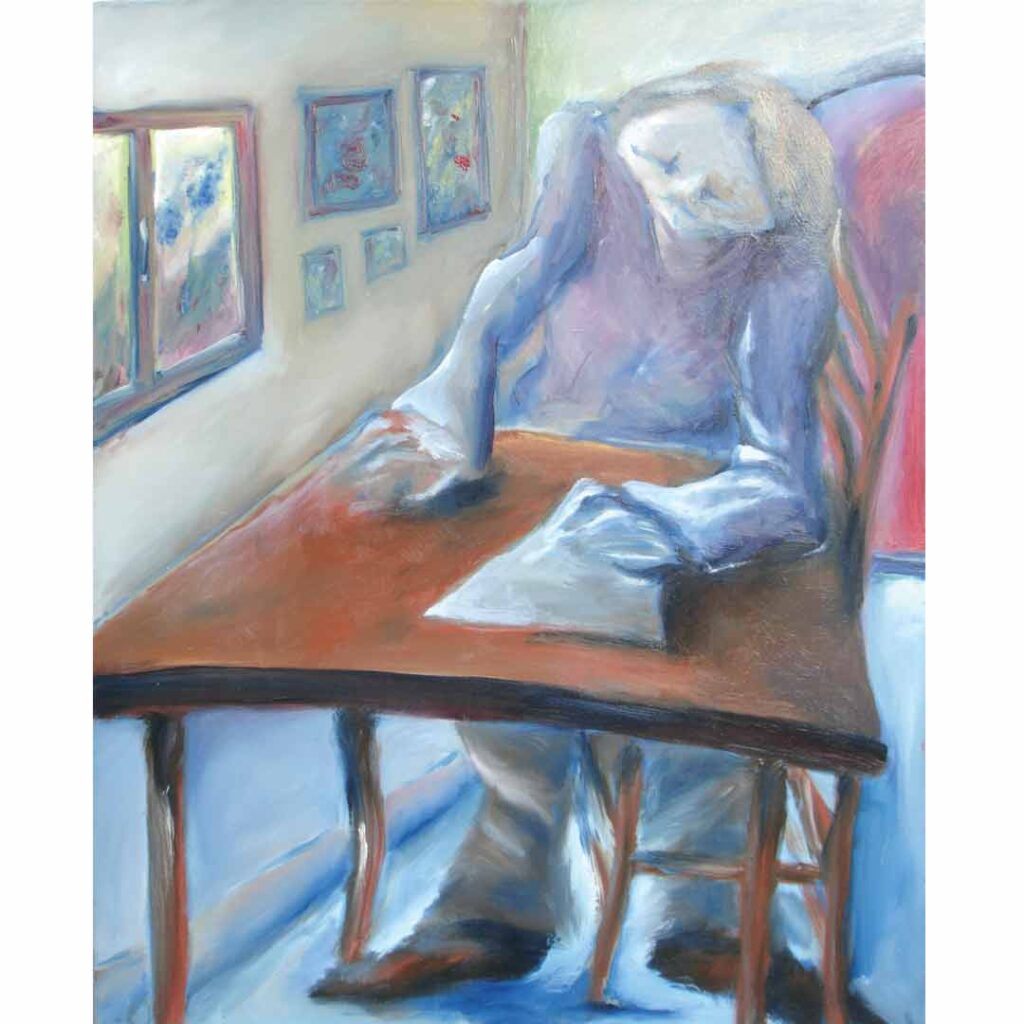 Così definita e dai tratti romantici, vive un dramma da chiudersi il viso tra le mani, e esce da uno spazio con una porta ad arco blu. La sedia rossa ha appoggiato il suo passato, in primo piano c’è un passaggio vitale.