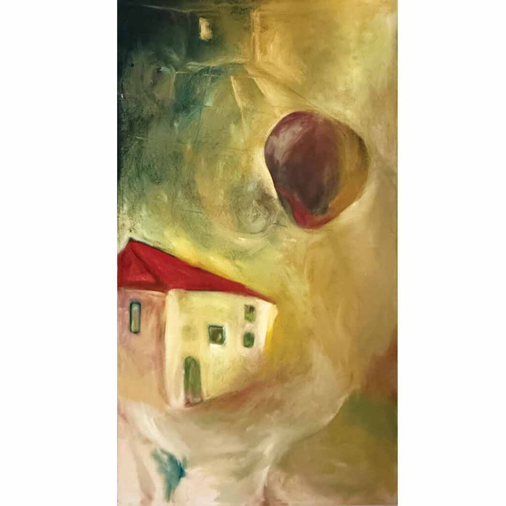 La sedia e un disegno appeso sulla parete di fondo, la donna freme in una posizione inclinata, il suo istinto è alzarsi. Il colore rende evidente la spinta che il corpo sta compiendo. Spazi dettagliati dal primo piano fino tutta la scena.